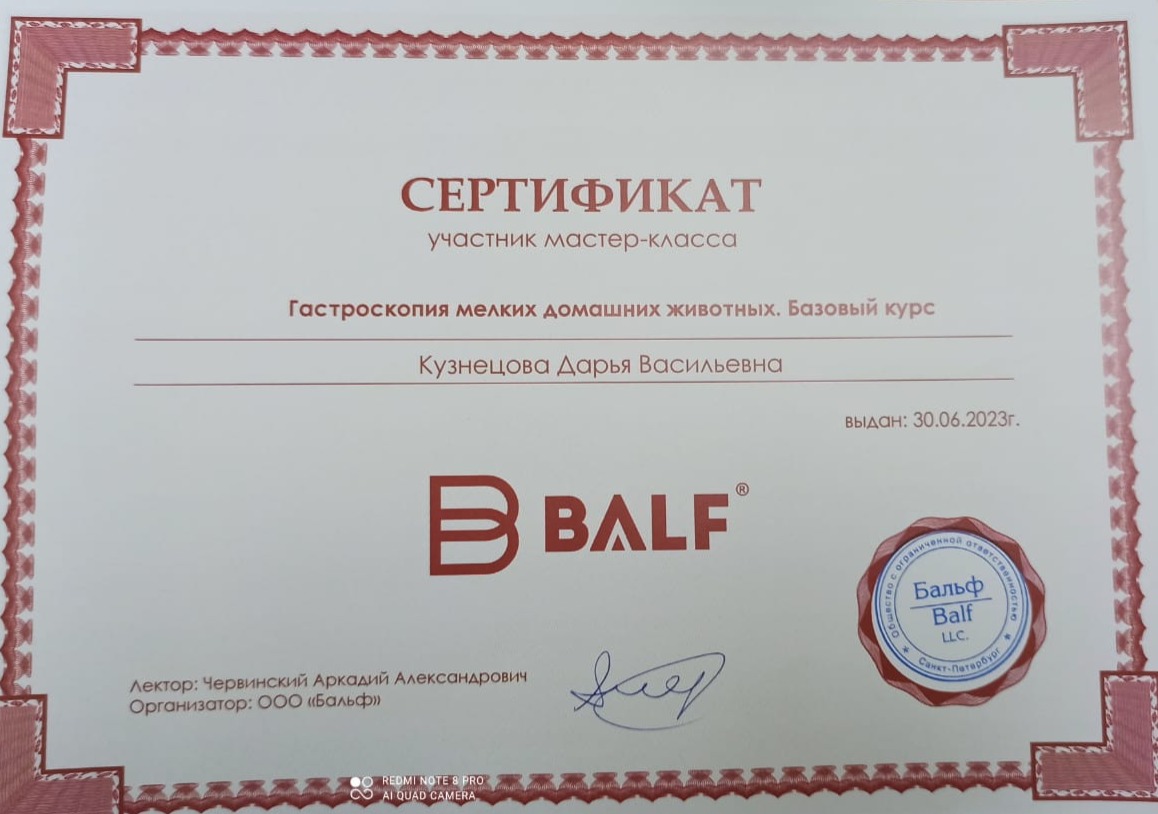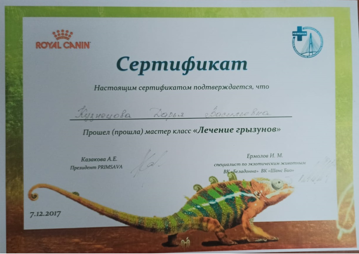 Постоянно совершенствует свои знания через участие в специализированных образовательных программах. С 2020 года является активным участником вебинаров на авторитетной ветеринарной платформе Webexovet, где регулярно изучает современные подходы к лечению экзотических животных.